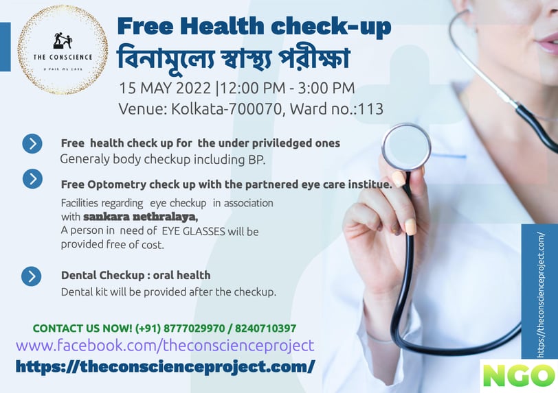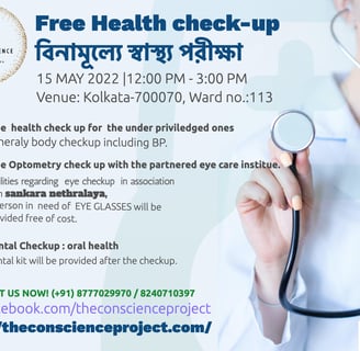 In times of crisis and need, we should prepare ourselves & the best way to do it, take care of health. TheCONSCIENCE will help you to take care of that & create a health care awareness. Organising a FREE medical camp (General physician, Ophthalmologist & Dentist ) isn’t an easy task but we will try our level best to organize our FIRST Health CAMP for under privileged members of the society. Target Area: Kolkata-700070 | Target No. of Beneficiaries: 300 Feel free to help us to share well being, with under-privileged people to get healthcare free of cost.